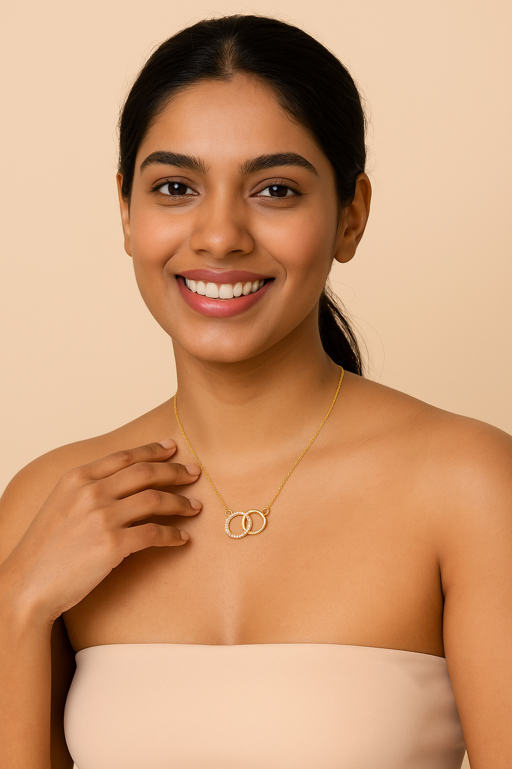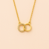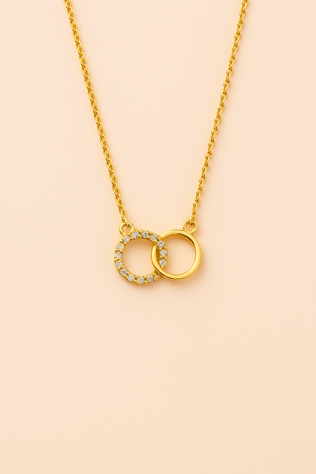 A stunning gold chain pendant featuring two interlocked circles, one adorned with sparkling stones, symbolizing love and unity. A perfect accessory for everyday elegance.
