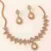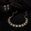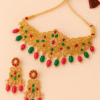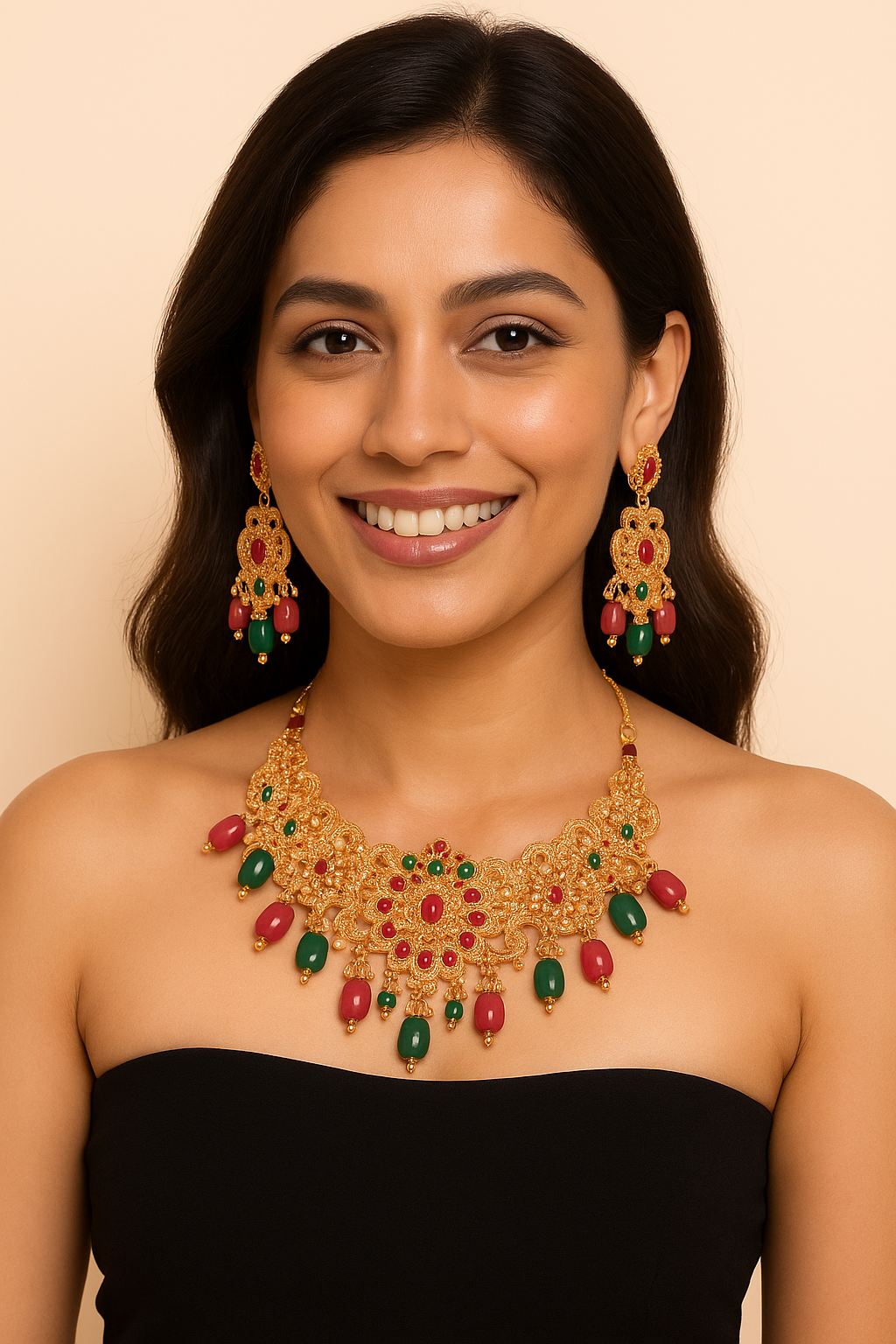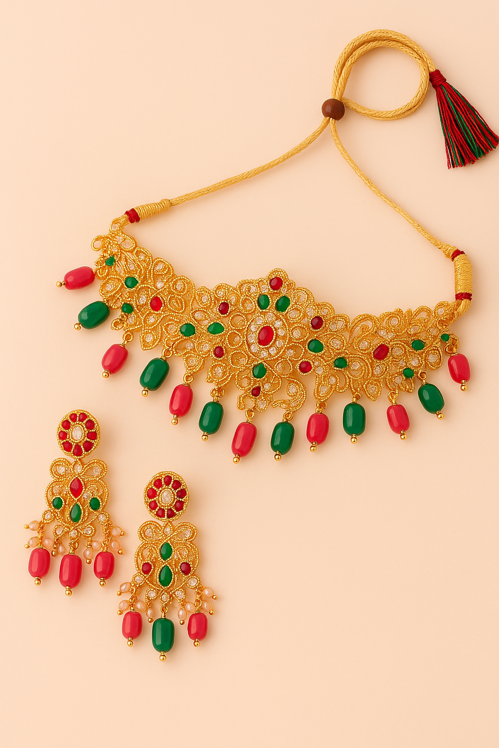 A luxurious gold-tone choker with intricate floral detailing, accented by red and green beads. Paired with matching statement earrings, perfect for weddings and festive occasions.