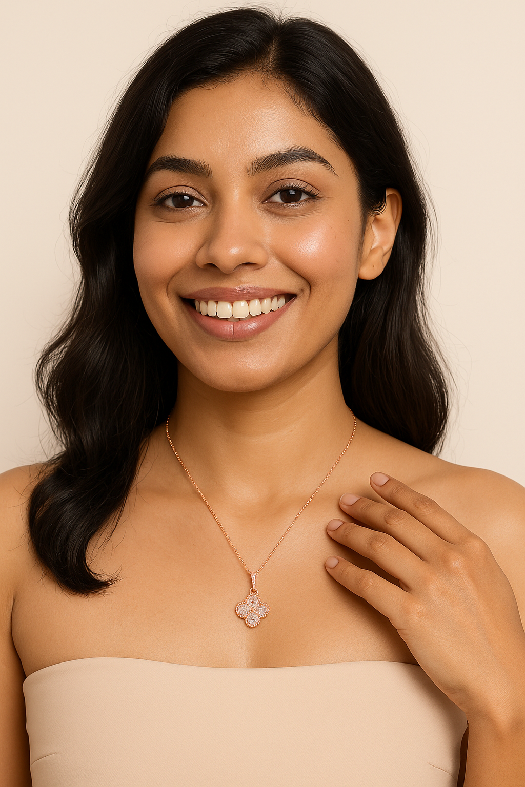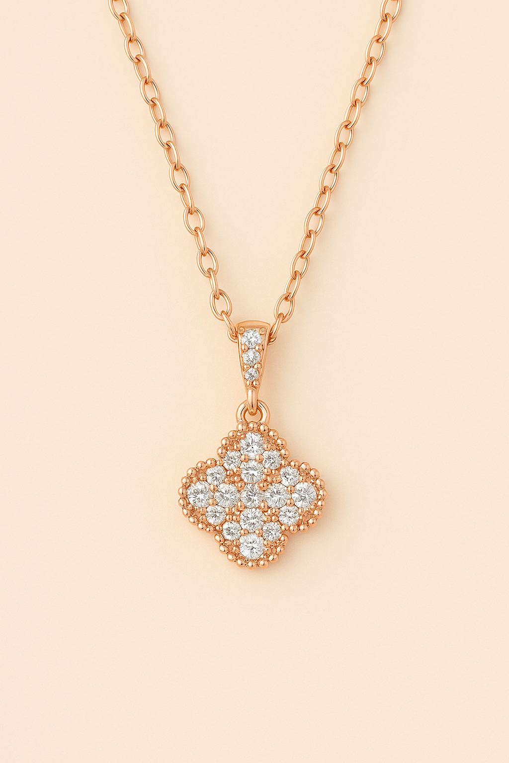 Add to cartA beautifully crafted rose gold pendant featuring a clover-shaped design encrusted with dazzling stones. A symbol of elegance and good fortune, perfect for any occasion.